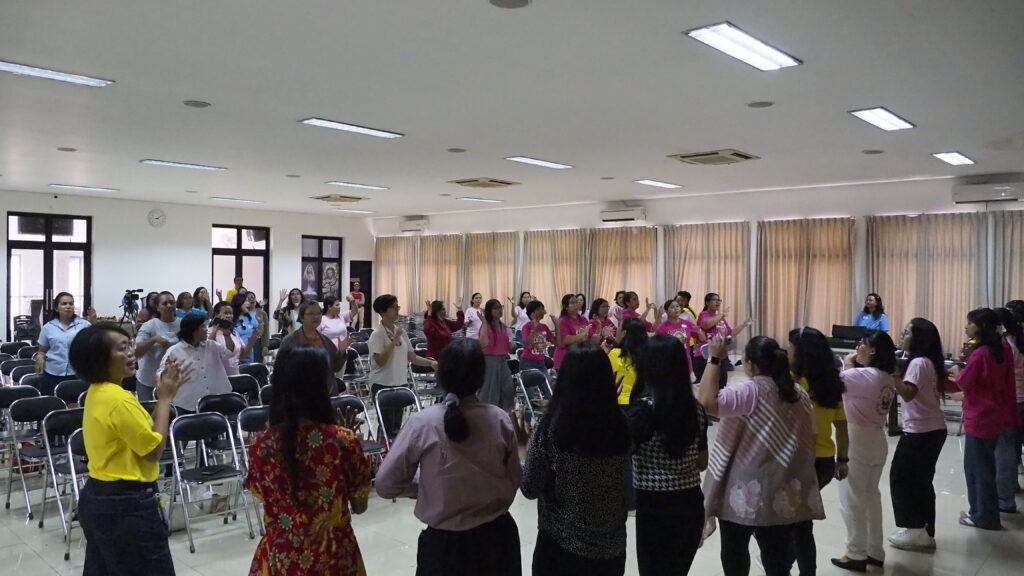 Suasana penuh semangat dan sukacita terasa sejak awal acara, yang diawali dengan lagu dan gerak bersama seluruh peserta. Menariknya, setiap paroki hadir dengan kaos seragam masing-masing yang berbeda warna, mewakili identitas dan semangat khas dari setiap komunitas, menambah warna dan keindahan dalam kebersamaan hari itu.